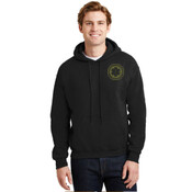 This military green Gildan 50/50 hoodie is printed with a one color CONTOMS logo on the left chest and on the full back. The American Flag is printed on the right sleeve.